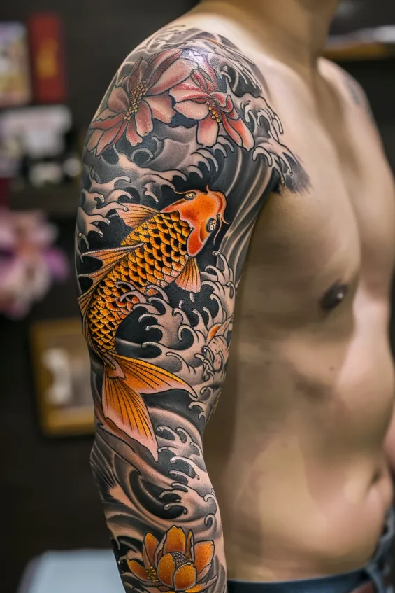 A vibrant orange koi fish swims through swirling black and grey waves, its golden scales shimmering with incredible detail. Cherry blossoms and lotus flowers weave into the design, adding a soft contrast to the bold movement of the water. This full sleeve captures the strength and perseverance koi fish represent in Japanese culture, making it a powerful yet artistic statement.