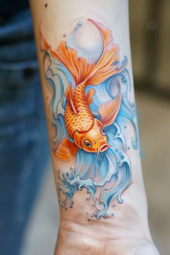 Koi fish tattoos always carry a deep meaning, but this one is next-level stunning. The way the water flows around the koi makes it feel like it s actually in motion, pushing forward with unstoppable determination. The contrast between the bright orange fish and the dark waves creates an eye-catching balance that just screams confidence and resilience. If you re looking for a tattoo that feels both fierce and elegant, this one s a knockout.