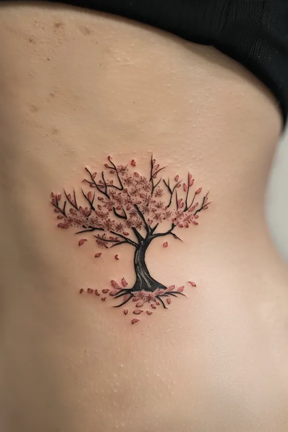 A gracefully curved cherry blossom tree stands tall on the ribcage, its branches adorned with soft pink petals that appear to be gently falling. The fine black ink of the trunk and branches contrasts beautifully with the subtle blush of the blossoms, creating a perfect balance between strength and softness. Each tiny petal adds to the sense of movement, making this tattoo feel as fleeting and poetic as sakura season itself.