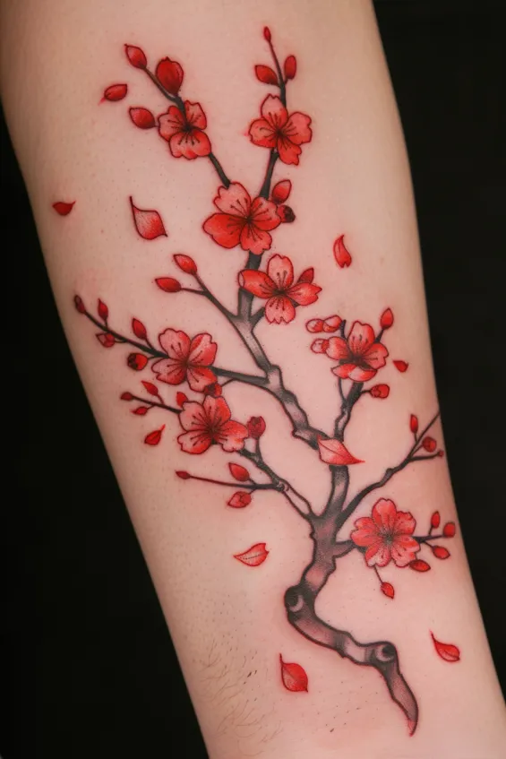 Soft pink and red cherry blossoms bloom across this delicate yet bold design, with a beautifully shaded black branch giving it depth and structure. The petals seem to be floating away, adding a sense of movement that makes the tattoo feel alive. The contrast between the rich blossoms and the dark branch makes each detail pop, capturing the fleeting beauty of sakura season.