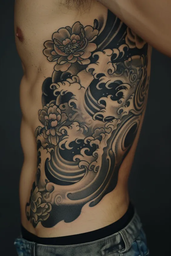 Powerful black and grey waves crash across the ribcage in this stunning Japanese-style tattoo, their swirling motion creating a bold and energetic flow. Soft peonies bloom between the currents, adding an elegant contrast to the dramatic movement of the water. The rich shading and intricate linework make every detail pop, giving the design a perfect mix of strength and grace.