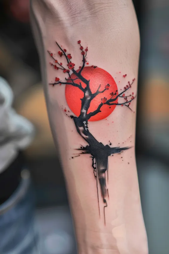 A striking cherry blossom tree stretches its branches across the skin, its dark ink blending into a bold watercolor-style red sun. The contrast between the soft red petals and the deep black trunk creates a stunning visual balance, making this tattoo feel both powerful and poetic. Subtle ink splashes give the design a raw, expressive energy, like a brushstroke straight from a traditional Japanese painting.