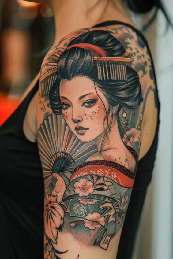 There s something about this tattoo that feels timeless. The expression on the geisha s face carries both strength and grace, making it impossible to look away. Every detail, from the intricate floral patterns to the fan s subtle folds, adds to the storytelling. It s a breathtaking piece that captures elegance, tradition, and a bit of quiet power all in one.