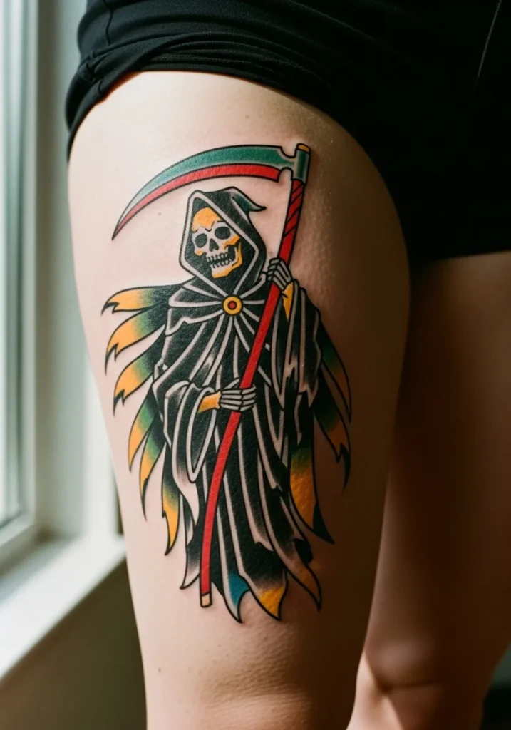 Colorful Grim Reaper Thigh Tattoo