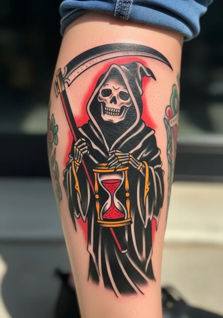 This stunning calf tattoo shows the Grim Reaper holding an hourglass, surrounded by a fiery red glow. It s done in true American traditional style, with bold outlines and rich blacks that contrast perfectly with the bright pops of red and gold. The hourglass adds an extra layer of meaning, symbolizing the passage of time, while the composition makes great use of the vertical space on the leg.