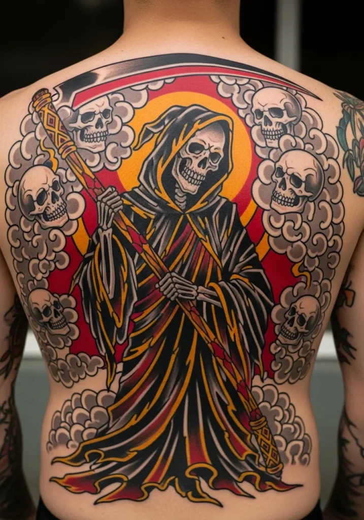 This full-back tattoo is a masterpiece of American traditional art. The Grim Reaper takes center stage, surrounded by swirling smoke and multiple skulls, all framed in bold red and gold. The robe s deep black shading contrasts sharply with the warm tones, creating incredible visual depth.