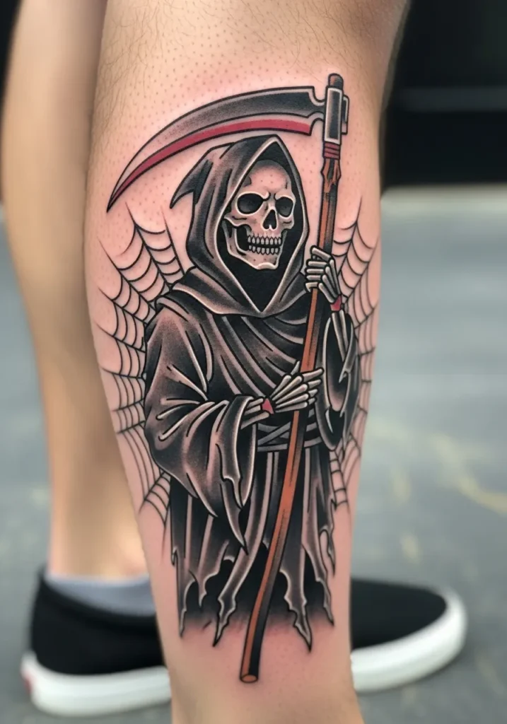 This detailed calf tattoo shows the Grim Reaper standing in front of a web backdrop, adding a slightly eerie twist. The design is rich in contrast, with dark blacks, smoky grays, and touches of red that give it depth. The way the cloak blends into the web makes it feel like the Reaper is caught between worlds.