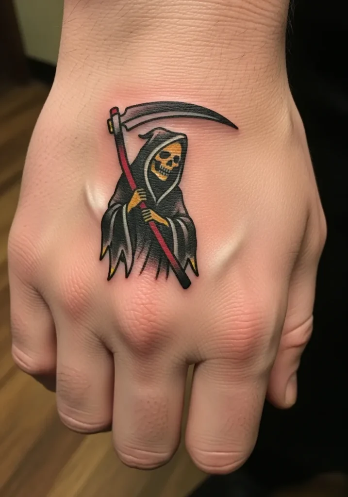 This small hand tattoo packs a lot of personality for its size. The design features a classic American traditional Grim Reaper with a red-handled scythe and a golden skull peeking from under the hood. The placement right on the hand makes it feel bold and confident, while the clean lines and saturated colors make it pop beautifully against the skin.