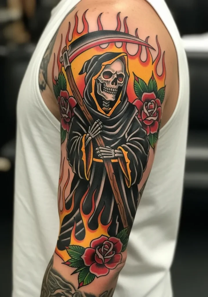 This bright and bold half-sleeve tattoo shows the Grim Reaper surrounded by flames and roses. It s an explosion of color, with deep reds, glowing oranges, and soft greens creating a vivid contrast against the black cloak. The robe has smooth shading and a golden outline that makes it pop beautifully against the skin. The flames wrapping around the arm give the design a flowing, dynamic movement.