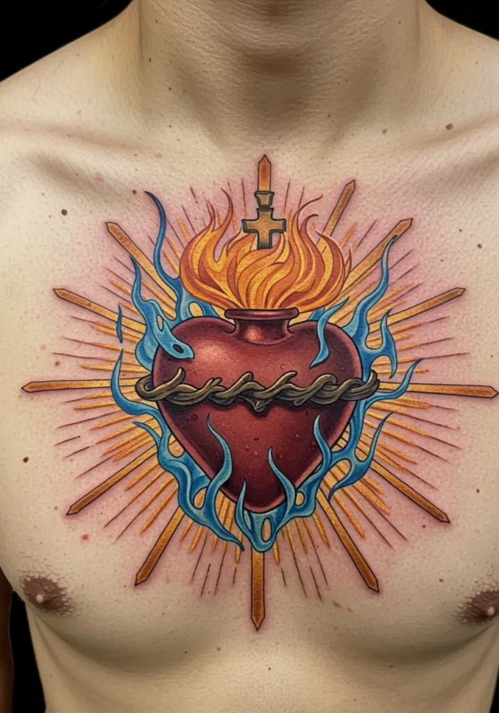 This vibrant chest piece showcases a stylized Sacred Heart bursting with meaning and color. The deep red heart is crowned with roaring orange flames, wrapped in a barbed wire that s highlighted by bold blue flames licking outward. A golden cross rises from the top, anchoring the design in spiritual symbolism. Everything is surrounded by radiant sunbeams, giving the whole tattoo this divine, glowing aura that feels like it s lit from within.