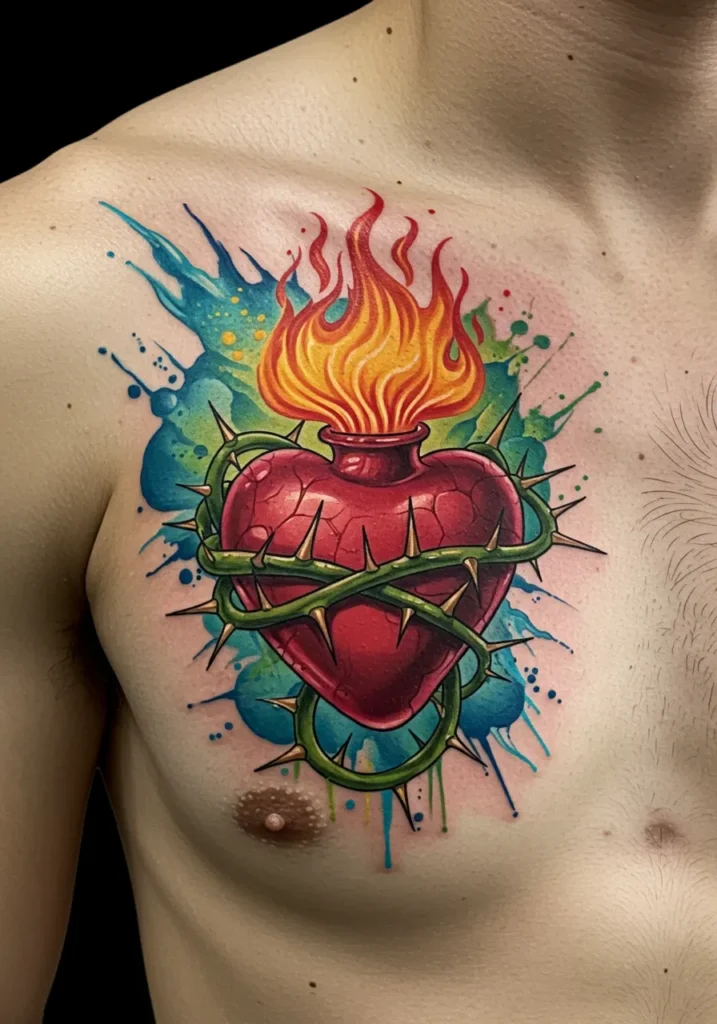 This vibrant chest tattoo brings the sacred heart to life in a totally fresh and artistic way. The heart itself is a deep, rich red, wrapped tightly in a vivid green crown of thorns that twists and curls with bold intensity. Rising from the top is a bright flame in warm hues of orange and yellow, symbolizing divine love and passion. Behind it all is a wild splash of watercolor blues, greens, and hints of pink that look like a divine explosion of emotion. The whole piece feels like it s glowing right off the skin.