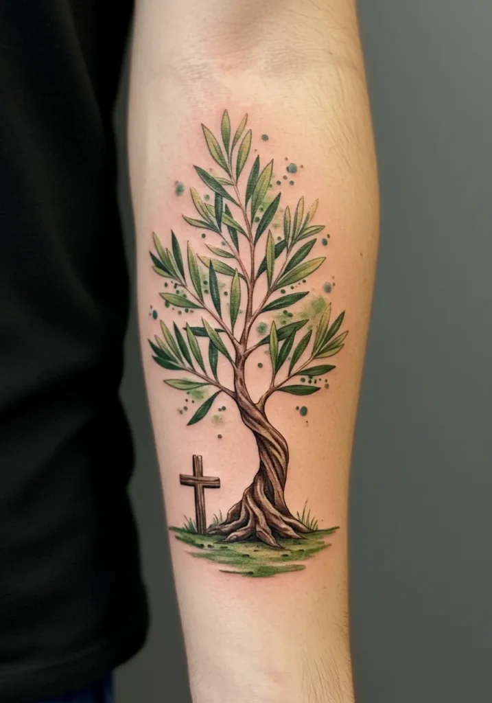 This forearm tattoo is soft, earthy, and full of peaceful symbolism. It shows a beautifully twisted olive tree growing out of a patch of green grass, with delicate branches stretching upward in a natural, airy style. Tucked beside the roots is a simple wooden cross, grounded but quietly powerful. The leaves have soft, natural shading in tones of green and olive, and there are tiny specks scattered in the background that give it a dreamy, watercolor-inspired look.