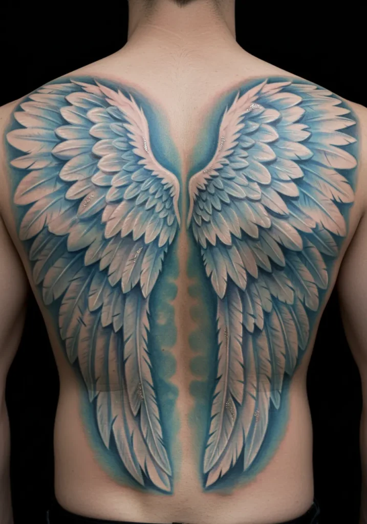 This breathtaking full back tattoo features a pair of radiant angel wings, perfectly placed to flow naturally with the contours of the back and shoulders. The feathers are layered in dreamy hues of soft blue and white, with hints of shimmer that make them almost look like they re glowing. Each individual feather is shaded to perfection, creating an incredibly lifelike texture that gives the wings a floating, almost weightless feel.