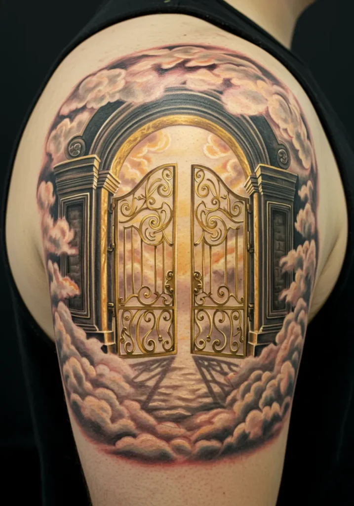 This heavenly shoulder tattoo captures a breathtaking view of the Pearly Gates surrounded by soft, dreamy clouds. The ornate golden doors sit open beneath a majestic archway, glowing with warm tones of peach and gold that feel like a divine sunrise. The clouds are shaded so delicately they almost look like cotton candy, and the light casting through the open gates makes the entire piece feel like a glimpse into the eternal.