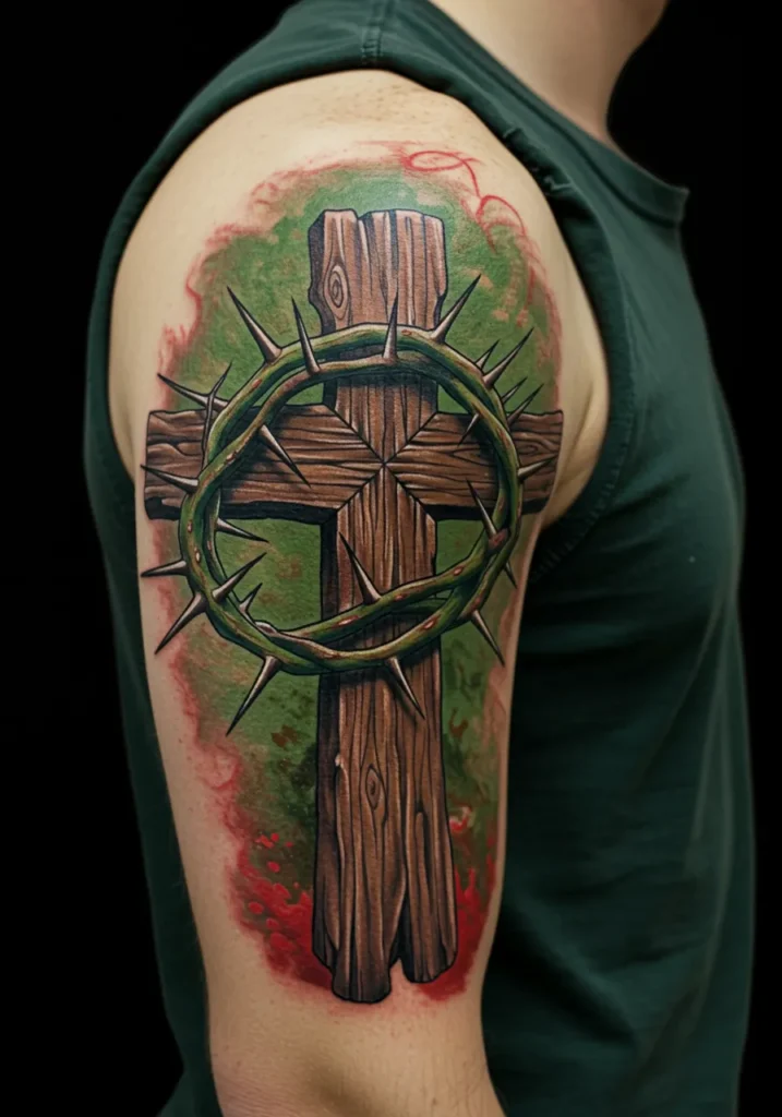 This bold shoulder tattoo features a rugged wooden cross drawn with deep grain textures that make it look almost carved into the skin. Resting over the cross is a green crown of thorns, thick and sharply detailed, wrapping around the center with dramatic tension. Behind it all is a smoky backdrop in earthy tones of olive green and muted red, giving the piece an intense, almost battlefield feel. The design is clean but powerful, and the contrast between the natural wood and thorny vines really makes everything pop.
