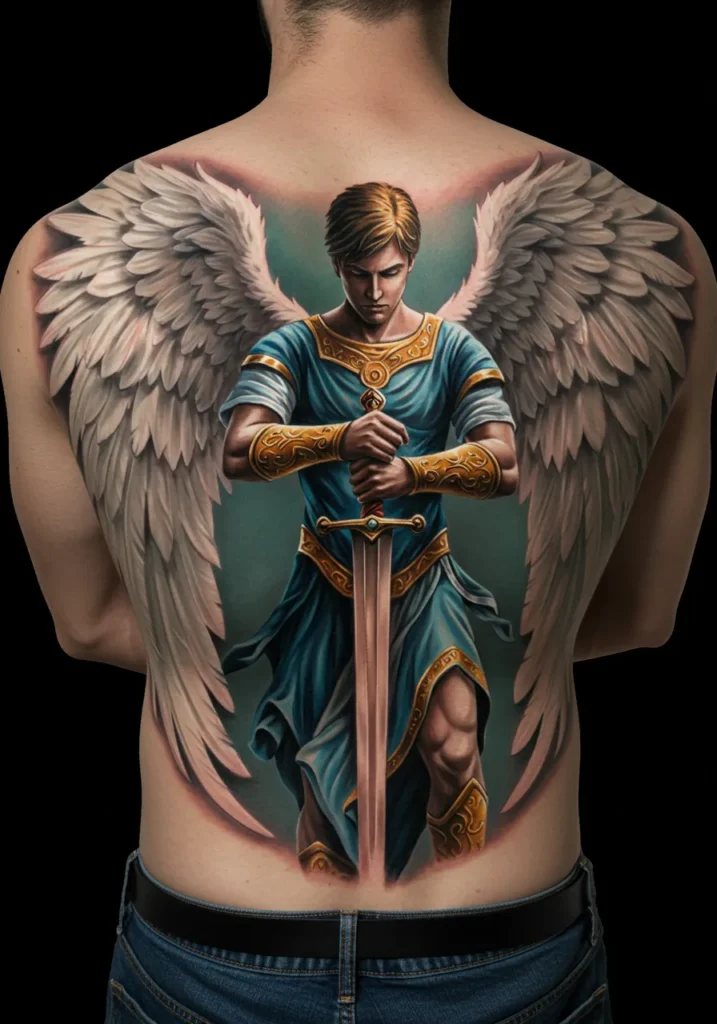This full back tattoo features a striking archangel in vivid teal-blue robes, standing firm with both hands resting on a long gleaming sword. His feathered wings stretch across the back in soft gradients of white, cream, and grey, giving the whole design a dreamy sense of movement. Golden armor wraps around his wrists, shoulders, and chest, with ornate detailing that feels fit for royalty. His expression is focused and calm, and the subtle glow behind him adds an ethereal, protective energy to the entire piece.