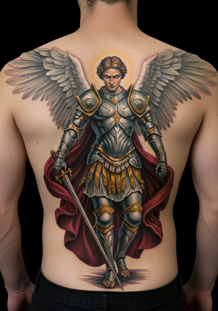 I m completely obsessed with how regal and cinematic this one feels. It s like stepping into a stained glass window scene, but on skin. I love that it doesn t just scream strength, it also carries this sense of calm and purpose. You can feel the quiet confidence in this angel s stance. Plus, the symmetry across the back is just chef s kiss. It s dramatic, meaningful, and beautifully done from every angle. Honestly, if you want something epic and spiritual, this is it.