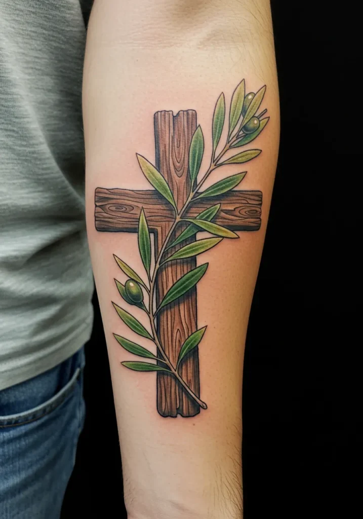 This tattoo is the definition of peaceful simplicity with a strong message behind it. It shows a beautifully shaded wooden cross, carved to look like weathered timber, with a lush olive branch curling across it from top to bottom. The leaves are a rich green with a hint of softness, and the little olives tucked into the design add the perfect touch of natural detail. The placement on the forearm gives it a clean, centered look that feels calm but confident.