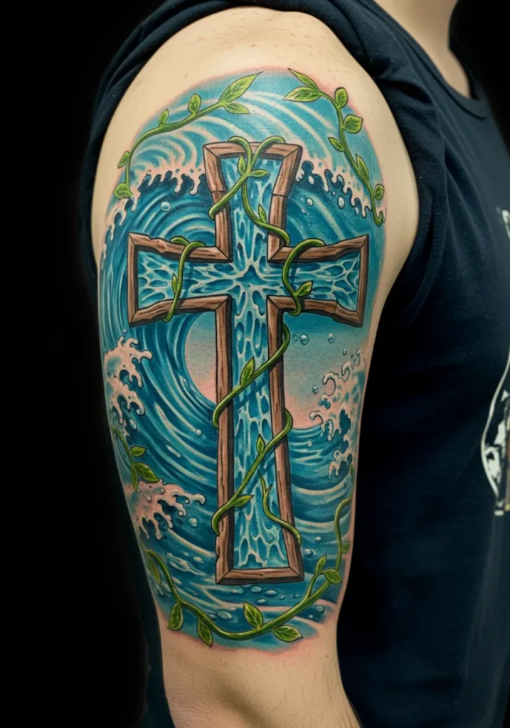 This upper arm tattoo is bursting with energy and symbolism. It features a bold wooden cross filled with flowing blue water that looks like it s pulsing with life. Surrounding it is a swirl of crashing ocean waves in rich turquoise and deep sea blue, with hints of pink foam that soften the movement. Wrapping gently around the cross are green vines with delicate leaves, adding a touch of nature and calm to the scene. The whole design feels alive, like something straight out of a dream where faith and nature collide.