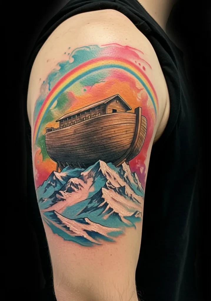 This shoulder tattoo is a colorful and bold tribute to one of the most iconic stories in the Bible. It features Noah s Ark resting on a peak of snowcapped mountains, with clean woodgrain detailing that makes the ark feel solid and sturdy. Above the ark, a full rainbow arcs across a dreamy splash of pastel sky, blending oranges, pinks, blues, and teals together in a watercolor-like wash. The whole scene is framed in vivid color, creating this beautiful contrast between the grounded earth and the heavenly promise above.