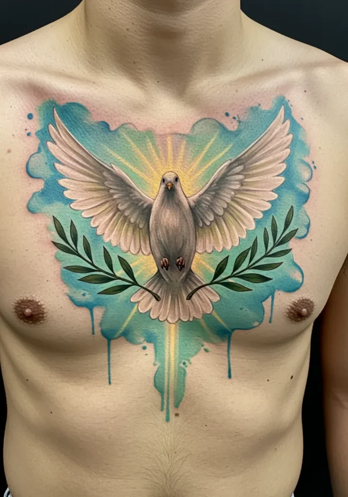 I really love how this tattoo balances softness and strength at the same time. The watercolor background keeps it modern and artsy, while the dove and olive branches tie it right back to classic spiritual meaning. It feels peaceful, hopeful, and powerful all at once. If you re looking for something that feels like a sacred centerpiece and looks amazing shirtless or peeking out from a button-down, this one totally nails it.