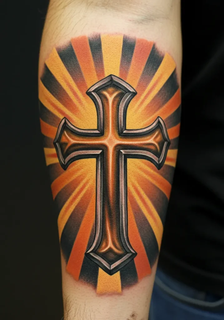 This forearm tattoo is bold, clean, and totally radiant. It features a polished metallic cross that looks like it was forged from bronze, with soft curves and beveled edges that give it serious depth. Behind it, rays of golden orange and deep black burst outward like a sunrise, creating this glowing halo effect that pulls all the attention straight to the cross. The whole piece has a crisp, almost 3D feel, and the color work is so vibrant it practically lights up the skin.