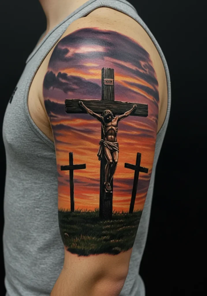 This powerful half sleeve tattoo brings the story of the crucifixion to life with breathtaking color and detail. At the center is a dark wooden cross with Jesus depicted in full detail, set against a dramatic sunset sky. Shades of fiery orange, deep purple, and soft lavender swirl together in the background, casting a glow over the entire piece. Two smaller crosses stand in the distance, subtly grounded by realistic grass textures at the bottom. The contrast between light and shadow here makes everything feel cinematic and deeply emotional.