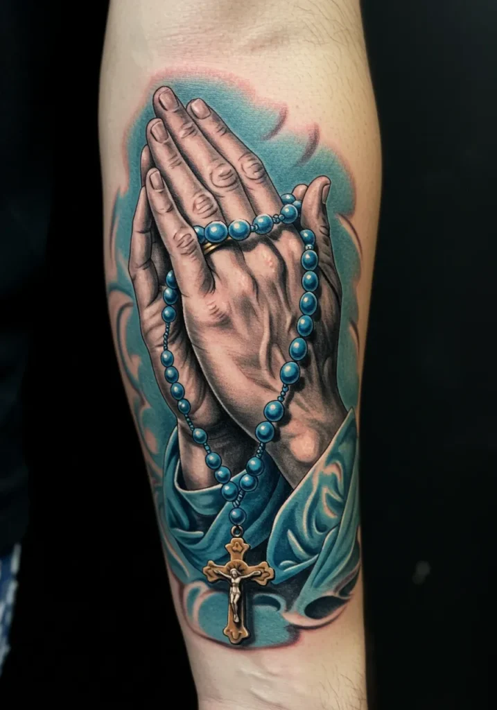 This forearm tattoo is a stunning take on a timeless design. It shows two hands gently clasped in prayer, shaded with soft, lifelike detail and wrapped in flowing blue fabric. Draped over the fingers is a rosary made of bright blue beads that pop beautifully against the muted tones of the hands. At the end of the rosary is a small crucifix in rich gold and bronze hues, adding that extra sacred touch. The background has a smoky, watercolor feel in soft teal and blush tones that gives the whole piece a glowing, reverent vibe.