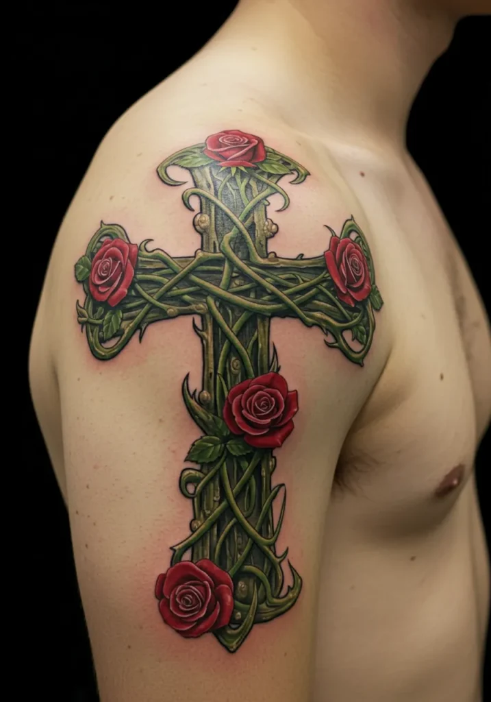 This shoulder tattoo is such a beautiful blend of strength and softness. It features a wooden cross intricately wrapped with thorny vines and blooming red roses at each major point. The detail is unreal, from the texture of the bark to the velvety depth of each petal. Everything is framed so cleanly against the skin, and the rich greens and reds just pop in the most stunning way.