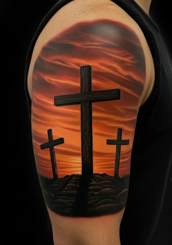 This shoulder tattoo captures a powerful moment in the simplest, most striking way. Three wooden crosses stand silhouetted on a rocky hill, centered against a glowing sunset sky in deep reds, burnt oranges, and warm golden hues. The main cross stands tall in the center while the two others lean just slightly, giving a perfect sense of depth and perspective. The textured shading of the ground adds a grounding feel, and the sky is just dramatic enough to make the scene feel emotional without going over the top.