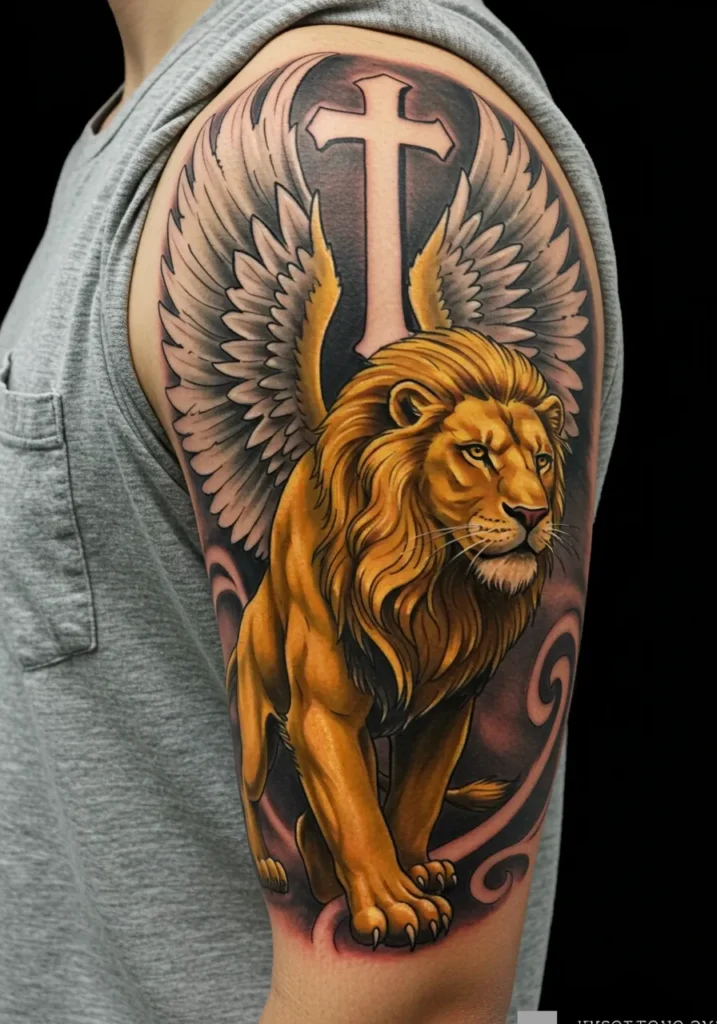 This tattoo features a fierce golden lion standing proud, its powerful body wrapped in warm amber tones that make the fur almost glow. Behind it, a massive set of white angel wings spreads wide, framing a bold white cross that seems to pierce the heavens. The whole piece flows perfectly with the curve of the upper arm, and the rich contrast between the lion s strength and the divine elements gives it a super intense presence. The swirls of dark rose and soft shading in the background pull everything together like a dramatic spotlight.