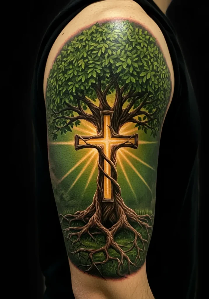 This stunning upper arm piece blends natural beauty with powerful symbolism. A large, flourishing tree with intricate roots and rich green leaves forms the backdrop, while a radiant golden cross sits at its center, glowing from within the trunk like divine light breaking through nature. The roots grip into the earth with depth and detail, while the cross shines out into the open space, surrounded by soft rays of light. It s spiritual, grounded, and bursting with life.