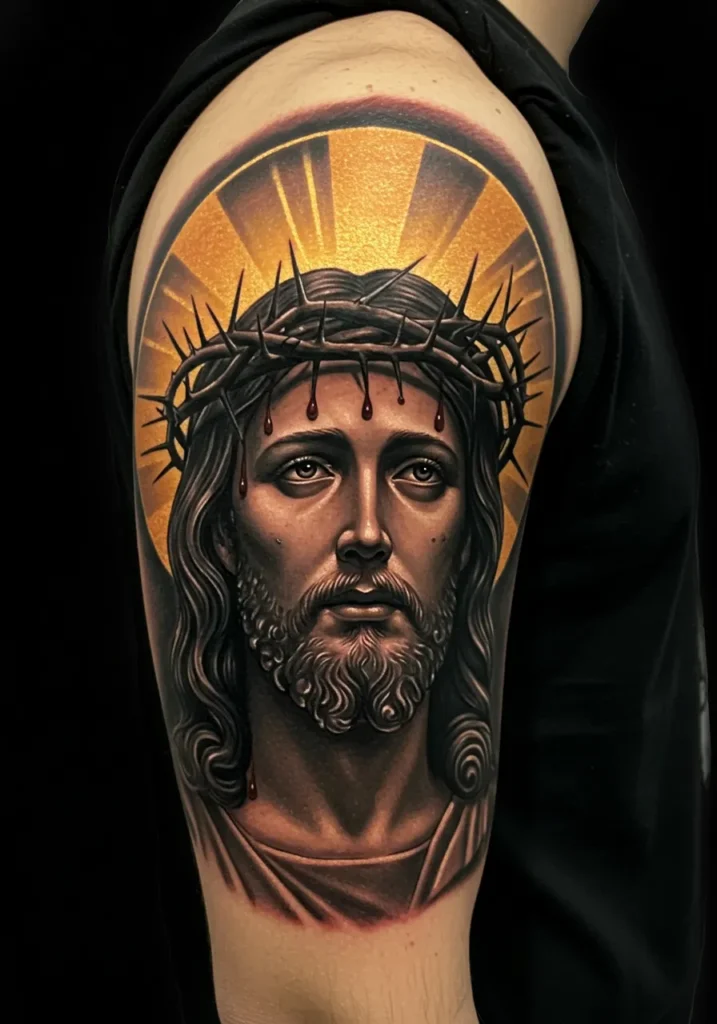 This upper arm tattoo is incredibly detailed and deeply emotional. It features a lifelike portrait of Jesus wearing the crown of thorns, his face solemn and serene, with drops of blood gently trickling down. Behind him is a radiant golden halo made up of glowing beams, adding warmth and divine presence to the piece. The shading on his face and beard is beautifully soft and realistic, and the eyes have that gentle, soulful look that just stops you in your tracks. Every line and shadow feels like it carries meaning.