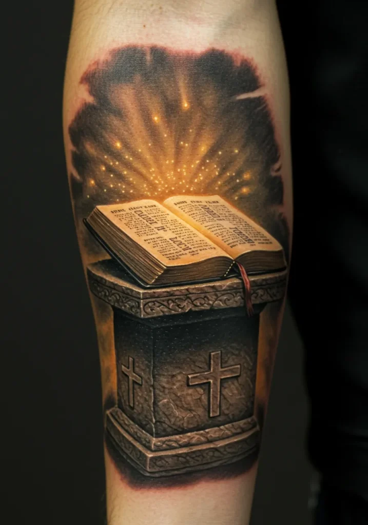 This forearm tattoo is all about reverence and light. It features a thick, open Bible resting on a stone altar that s been beautifully shaded to look solid and ancient. The book s pages are carefully detailed with visible text, and behind it, a radiant burst of golden light spills upward like a halo made of stars. The soft edges of the glow blend into a smoky background, giving the whole piece this ethereal, almost heavenly feel. The altar itself is carved with crosses on each face, tying the symbolism together with a grounded, timeless look.