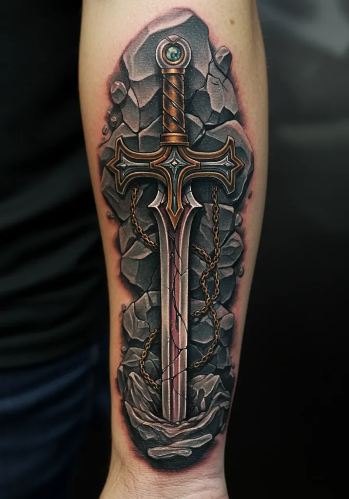 This forearm tattoo is pure drama in the best way possible. It shows a beautifully detailed sword driven straight into cracked stone, with golden chains curling around the blade like it s been sealed there for centuries. The sword s hilt is rich with metallic bronze and gold tones, and there s a small jewel at the top that gives it a divine, almost otherworldly feel. The rocky background is shaded with smoky greys and deep shadows, making the sword the clear star of the show.
