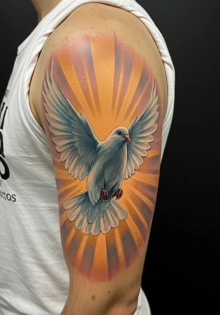 This upper arm tattoo is bright, bold, and totally uplifting. It features a beautifully shaded dove in mid-flight, wings outstretched with soft blue and white tones that feel light and airy. Behind the bird is a dramatic burst of radiant golden-orange light, fanning out in all directions like sunbeams. The background almost feels like it s glowing, which makes the dove pop even more. The clean, centered design hugs the shoulder perfectly, creating a super balanced and eye-catching look.