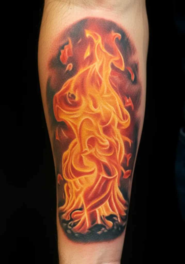 This forearm tattoo brings the biblical burning bush to life with intense energy and movement. The flames twist and curl in shades of fiery orange, deep amber, and glowing yellow, rising upward in a powerful yet graceful display. The dark background helps the fire stand out even more, almost making it feel like it s dancing off the skin. You can just imagine the sacred voice within the flame, with the swirling heat hinting at something divine and mysterious.