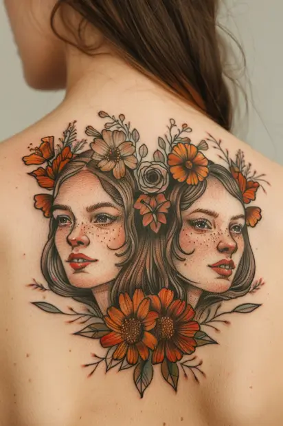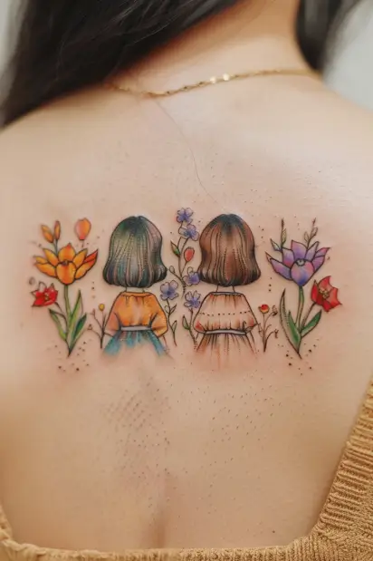 This tattoo showcases the portraits of two sisters surrounded by vibrant flowers, placed on the upper back. The detailed design uses a mix of warm colors and fine lines to create a lifelike and beautiful image.