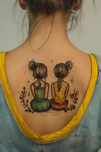 This tattoo features two young girls sitting with their backs to the viewer, placed on the upper back. The design is colorful and detailed, showing the girls in simple dresses surrounded by flowers and plants. The whimsical style adds charm to the piece.