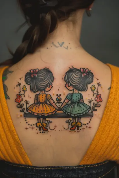 This is a lovely tattoo because it represents the innocence and joy of growing up together. The colorful and detailed design makes it a perfect tribute to the sisters bond.