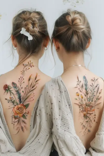 These tattoos feature beautifully detailed floral designs on the backs of two sisters. Each design includes a variety of flowers and leaves, creating a vibrant and colorful look. The tattoos are placed on the upper back, perfectly aligned when the sisters stand side by side.