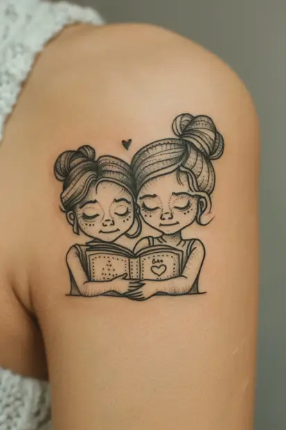 This tattoo depicts two young girls reading a book together, placed on the shoulder. The black ink design is detailed, showing the sisters peaceful expressions and the heart on the book cover.