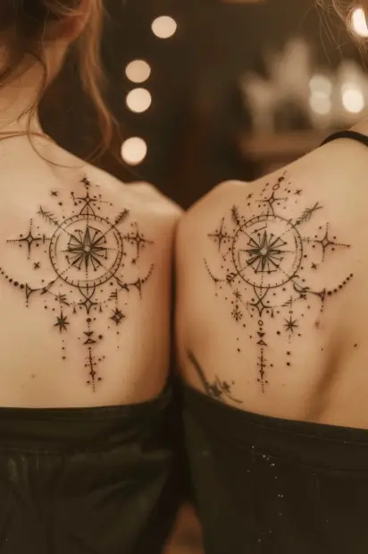 These tattoos showcase a compass design on the shoulder blades of two sisters. The black ink work includes intricate details and fine lines, creating a striking and cohesive look. When the sisters stand side by side, the compasses align, emphasizing their journey together.