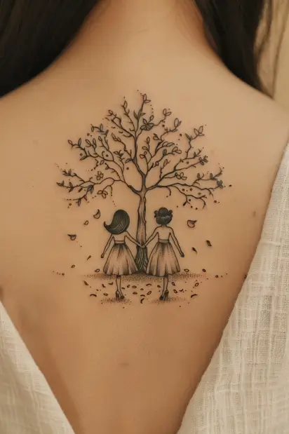 This tattoo features two sisters standing under a tree, placed on the upper back. The black ink design includes detailed branches and leaves, symbolizing growth and connection. The girls simple dresses and the falling leaves add a touch of whimsy to the piece.