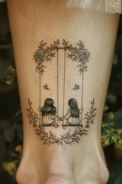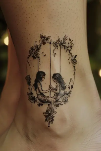 This tattoo features two sisters sitting on a swing, placed on the ankle. The black ink design is framed by delicate flowers and vines, creating a whimsical and peaceful scene.