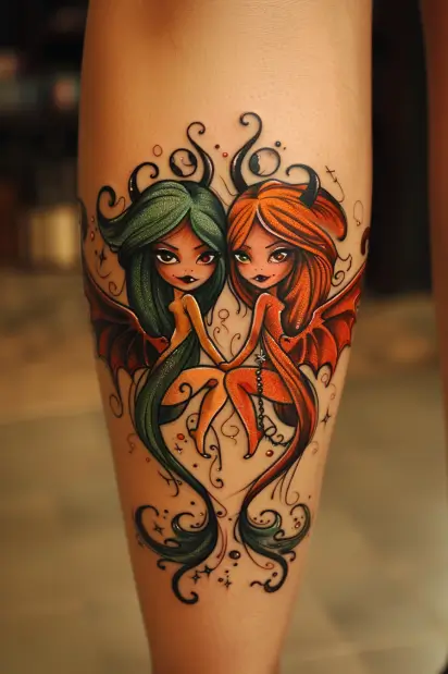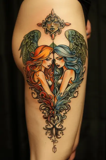 This tattoo shows two sisters as angel and demon, placed on the thigh. The colorful design uses vibrant shades to distinguish the two figures, with intricate wings and flowing hair. The symmetrical layout adds balance to the piece.