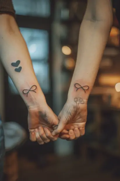 These tattoos feature a minimalist infinity symbol on the wrists of two sisters. The simple black line design is clean and elegant, representing the infinite bond between them. The tattoos are placed on the inner wrists, easily visible when the sisters hold hands.
