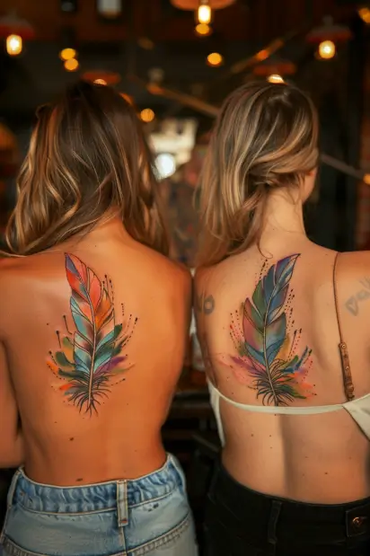 These tattoos display vibrant, multicolored feathers on the backs of two sisters. The feathers are filled with a rainbow of colors, creating a striking and eye-catching design. The placement on the upper back ensures that the tattoos are prominently displayed.