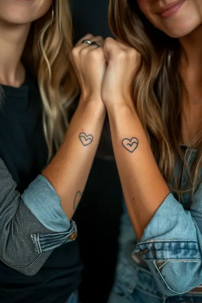 These tattoos feature simple heart outlines on the forearms of two sisters. The minimalist black ink design is clean and straightforward, symbolizing their love and connection. When the sisters place their arms together, the hearts align perfectly.
