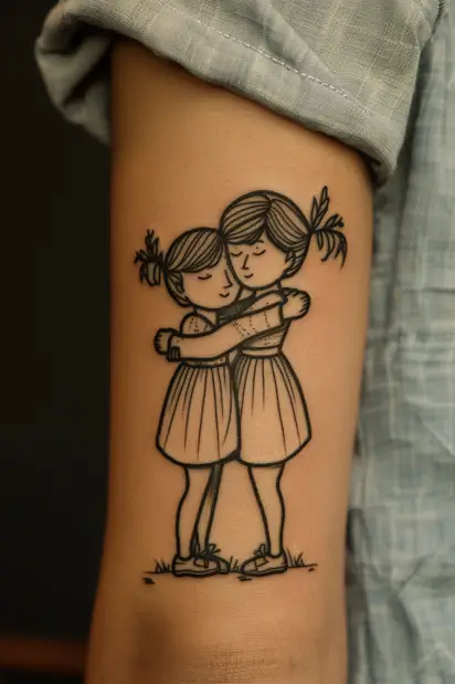 This tattoo shows two young girls hugging, placed on the inner arm. The black ink design is simple yet detailed, capturing the warmth and affection between the sisters. The clean lines and shading add depth to the piece.
